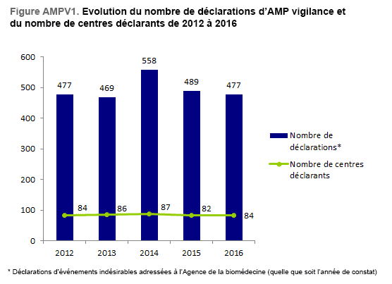 Figure AMPV1. Evolution du nombre de déclarations d’AMP vigilance et du nombre de centres déclarants de 2012 à 2016