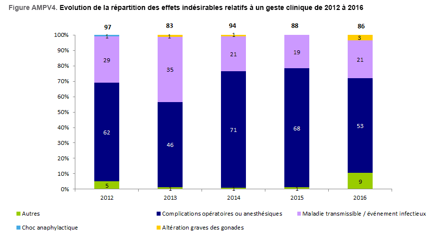 Parmi les 477 déclarations d’événements indésirables, l’Agence de la biomédecine a reçu 381 effets indésirables dont 96,9% étaient des effets graves (n=369), c’est-à-dire susceptibles d’entraîner la mort ou de mettre la vie en danger, d’entraîner une invalidité ou une incapacité, de provoquer ou de prolonger une hospitalisation ou tout autre état morbide ou susceptibles de se reproduire chez un ou plusieurs donneurs ou personnes qui ont recours à l’AMP.