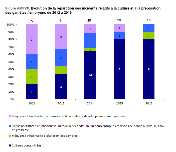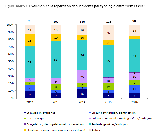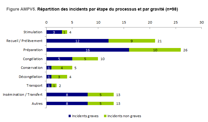 Parmi les 98 incidents déclarés, 85 étaient susceptibles d’entraîner une perte de gamètes, embryons ou tissus germinaux et donc d’aboutir à une perte de chance partielle ou totale qui a dans certains cas été évitée grâce à des mesures de récupération (mesures barrières). Pour 4 déclarations, les incidents concernaient à la fois les gamètes et les embryons.
