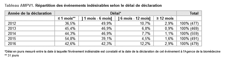 La répartition et l’évolution du délai de déclaration depuis 2012 est présentée dans le tableau TAMPV1.