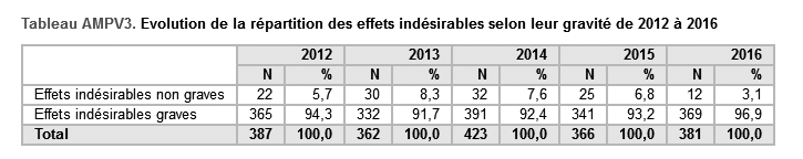 L’évolution du nombre de déclarations d’effets indésirables selon les classes d’activité (AMP, Autoconservation, Dons) est présentée dans le tableau TAMPV2.
