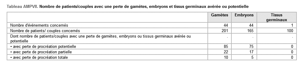 Tableau AMPV8. Nombre de patients/couples avec une perte de gamètes, embryons et tissus germinaux avérée ou potentielle