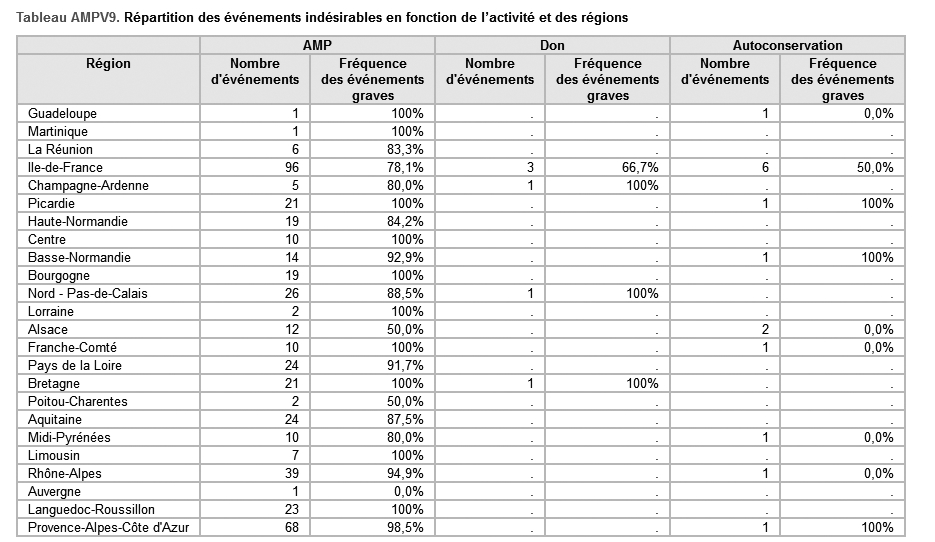 La répartition des événements indésirables en fonction de l’activité et des régions est représentée dans le tableau TAMPV9 ci-dessous.